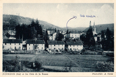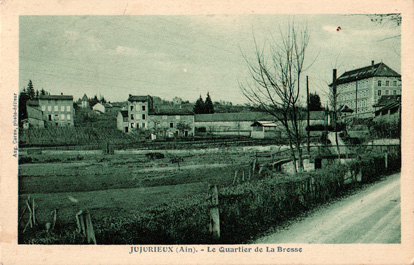 Vue du quartier avec les jardins ouvriers, le pont du tram, l'Usine Bonnet et le lavoir |