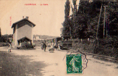 La gare (pour mémoire) : elle était située près de l’ancien champ de foire, terminus de la ligne Tramways de l'Ain - Pont d’Ain – Jujurieux via Saint-Jean-le-Vieux, ligne qui se prolongeait dans l’enceinte de l’usine Bonnet par une tranchée en passant sous un pont métallique de 3,50 m d’ouverture. Cette gare des plus modestes n’en était pas moins de la catégorie de 1ère classe des Tramways de l’Ain. Elle possédait une pièce pour les voyageurs, avec un petit guichet derrière lequel l’employé de la gare avait son logement. Il y avait une halle à marchandise accolée et des latrines.