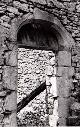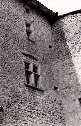 Une barbacane, à vingt mètres en avant de la porte, défendait l'entrée sur la cour du château, elle‑même alors surmontée d'une échauguette. A droite de l'entrée, le mur d'enceinte (de 2m 15 d'épaisseur) barre le sommet jusqu'au ravin ; sur sa gauche, une tour, forte de six embrasures défend l'angle de la cour dite basse. La prison située dessous est qualifiée de "grotton" [taillée dans la roche ?] d’après un texte de 1640. L'enceinte sud surplombe un repli rocheux (sous lequel, à trente pas des murs, une citerne naturelle rafraîchit un mètre cube d'eau), et rejoint le poulailler (lui‑même surmonté jusqu'au XVIIIeme siècle d'une tourelle protégeant l'angle sud‑ouest des constructions). Un bâtiment bas, face à l'entrée, est doté de deux portes (étable et écurie), la troisième, située sous le haut bâtiment à deux étages, ouvre sur la cave, creusée en partie dans la roche, et dont la voûte est renforcée d'un système d'arches original. Le bâtiment situé en avant et au‑dessus de la cave, à sa droite est le donjon, rabaissé d'un étage. Une embrasure à chaque étage, presque dans l'angle formé par les constructions, en menaçait l'attaquant, mais protégeait de même la porte d'accès à la haute‑cour, qui fermait la cour basse du donjon au mur d'enceinte. De la terrasse supérieure, d'où le regard se perd sur le ravin, on pénètre dans le château par une porte ouverte au XVIeme siècle, mais plus loin, près de l'éboulement, on distingue l'excavation dans laquelle coulissait la poutre fermant la porte du rempart original (fin du XIIIeme siècle). Les quelques marches franchies, à droite était la "chambre de madame", avec ses latrines sur le vide ; à gauche, la prison, voûtée, qu'éclairaient avec peine deux archères, fut dotée d'une fenêtre et d'un four vers 1720. Passant sous l'élégante voûte chanfreinée du XVIeme siècle, on traverse à droite ce qui était les cuisines pour accéder à la "chambre de monsieur", éclairée par deux belles fenêtres à meneaux, avec sa grande cheminée. A gauche de l'entrée large et basse de cette "chambre", une porte étroite et haute permet de descendre à la cave par un escalier raide et tortueux. Accédant à la terrasse arrière du château, on longe, à droite, les ruines du grand four et du potager ; sur cette terrasse s'élevait une grosse tour carrée démolie vers 1720, dans laquelle on montait par une "viorbe" (escalier fermé, en appendice externe).