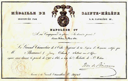 "...qu’ une Médaille commémorative sera décernée à tous les militaires qui ont combattu sous les drapeaux français de 1792 à 1815. Cette Médaille sera en bronze et portera d’un côté l’effigie de l’Empereur ; de l’autre, pour légende : Campagnes de 1792 à 1815, à ses compagnons de gloire, sa dernière pensée, 5 mai 1821. Elle sera portée à la boutonnière, suspendue par un ruban vert et rouge. "