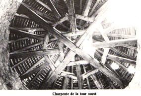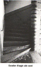 Les deux tours hexagonales, côté cour, enchâssent les beaux escaliers de pierre qui desservent les étages. Un vieil escalier de bois occupe la tour ronde du Sud.
