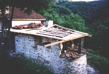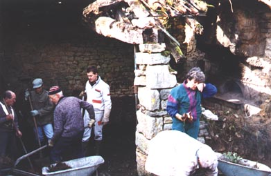 Après nettoyage des abords, démontage de la couverture, récupération des tuiles et poutres par certains membres et investissement dans les matériaux.