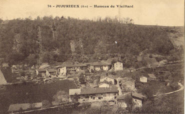 A l'extrême nord est de la commune voici Vieillard ,dans un site magnifique, sur les bords d'un gigantesque entonnoir. C'est un pays où le vignoble est conséquent fournissant des vins reconnus et d'excellente qualité. Il est certain que cet endroit fut dès la période romaine un lieu privilégié. Il ne fut, semble‑t‑il, pas toujours cet humble fief. Dès le XVème siècle, Vieillard faisait déjà partie de la paroisse de Jujurieux, mais dépendait de la baronnie de Châtillon‑de‑Cornelle. Ce hameau qui était en toute justice dépendait de Poncieux.Vieillard qui s'écrivit au cours des siècles Viellar, Vielliard, et enfin Vieillard, est riche d'histoire dont il ne reste pas ou très peu de vestiges. On trouve trace d'une chapelle, et notamment de son prêtre, Pierre Framinet, en 1531. Il subsiste trois vestiges, avec drapé, d'un statuaire(du XIVeme ou XVeme siècle). Ces statues restaurées en 1996, installées dans une niche près du four sont celles de saint Blaise, patron du hameau, saint Sébastien, saint Apollinaire. La tradition prétend que les statues pourraient avoir été jetées au moment de la révolution dans une vigne.
